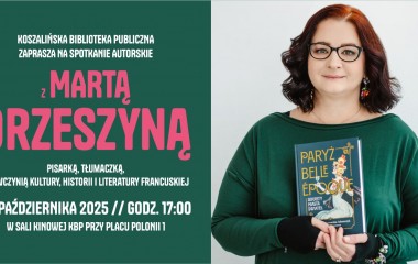 21.10.2025Koszalińska Biblioteka Publiczna zaprasza na spotkanie autorskie z Martą Orzeszyną - pisarką, tłumaczką, znawczynią kultury, historii i literatury francuskiej. 29 października 2025r. o godz. 17.00 w sali kinowej KBP przy placu Polonii 1. Marta... -