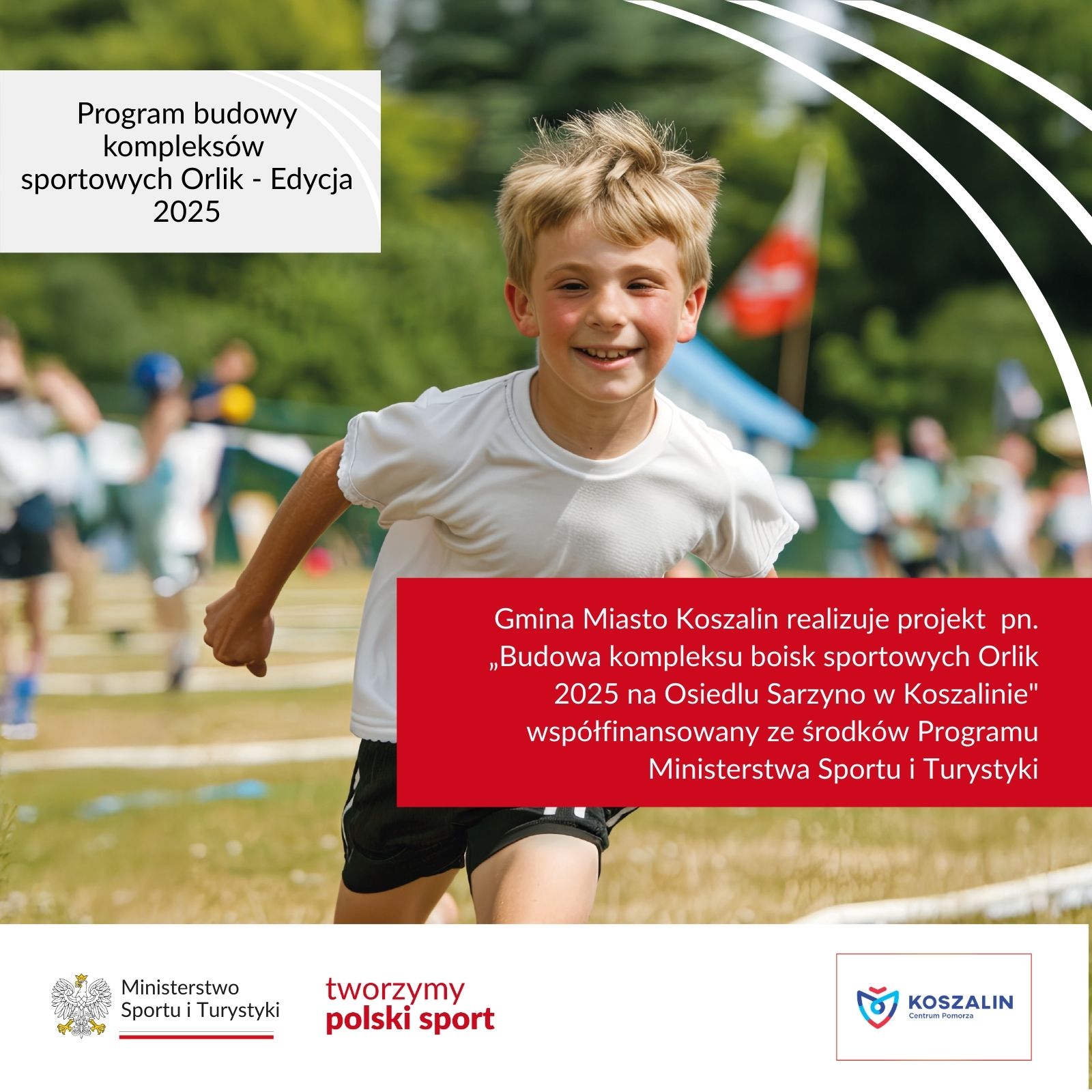 Gmina Miasto Koszalin realizuje projekt pn. „Budowa kompleksu boisk sportowych Orlik 2025 na Osiedlu Sarzyno w Koszalinie”.