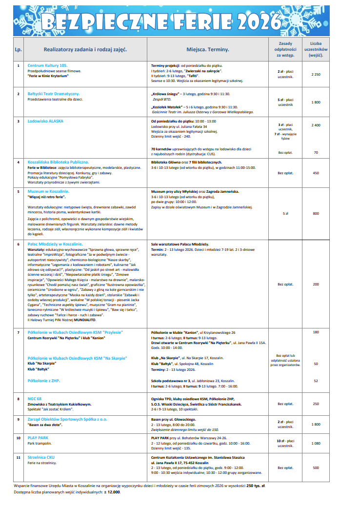 Szanowni Państwo, poniżej udostępniamy harmonogram tegorocznej edycji Bezpiecznych Ferii. Zachęcamy do zapoznania się i zapisywania dzieci na wydarzenia.