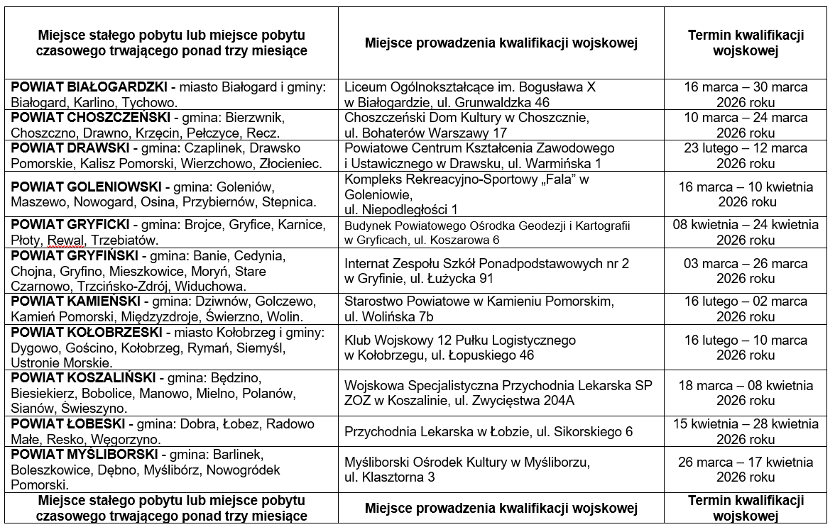 - W okresie od dnia 2 lutego 2026 r. do dnia 30 kwietnia 2026 r., będzie przeprowadzona kwalifikacja wojskowa na obszarze województwa zachodniopomorskiego.