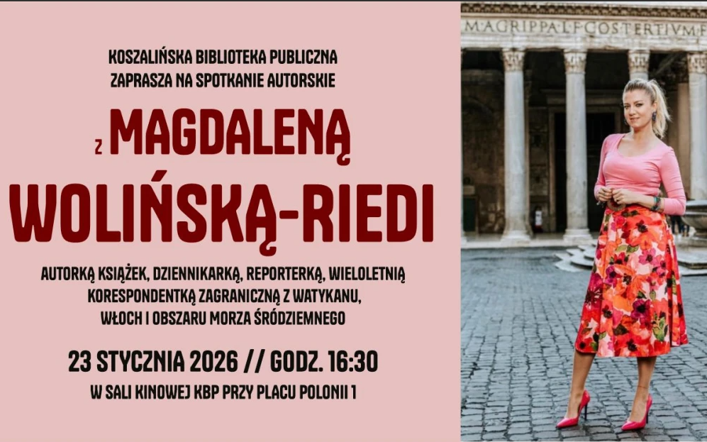 Koszalińska Biblioteka Publiczna zaprasza na spotkanie z Magdaleną Wolińską-Riedi – autorką książek, dziennikarką, reporterką oraz wieloletnią korespondentką zagraniczną z Watykanu, Włoch i obszaru Morza Śródziemnego.
