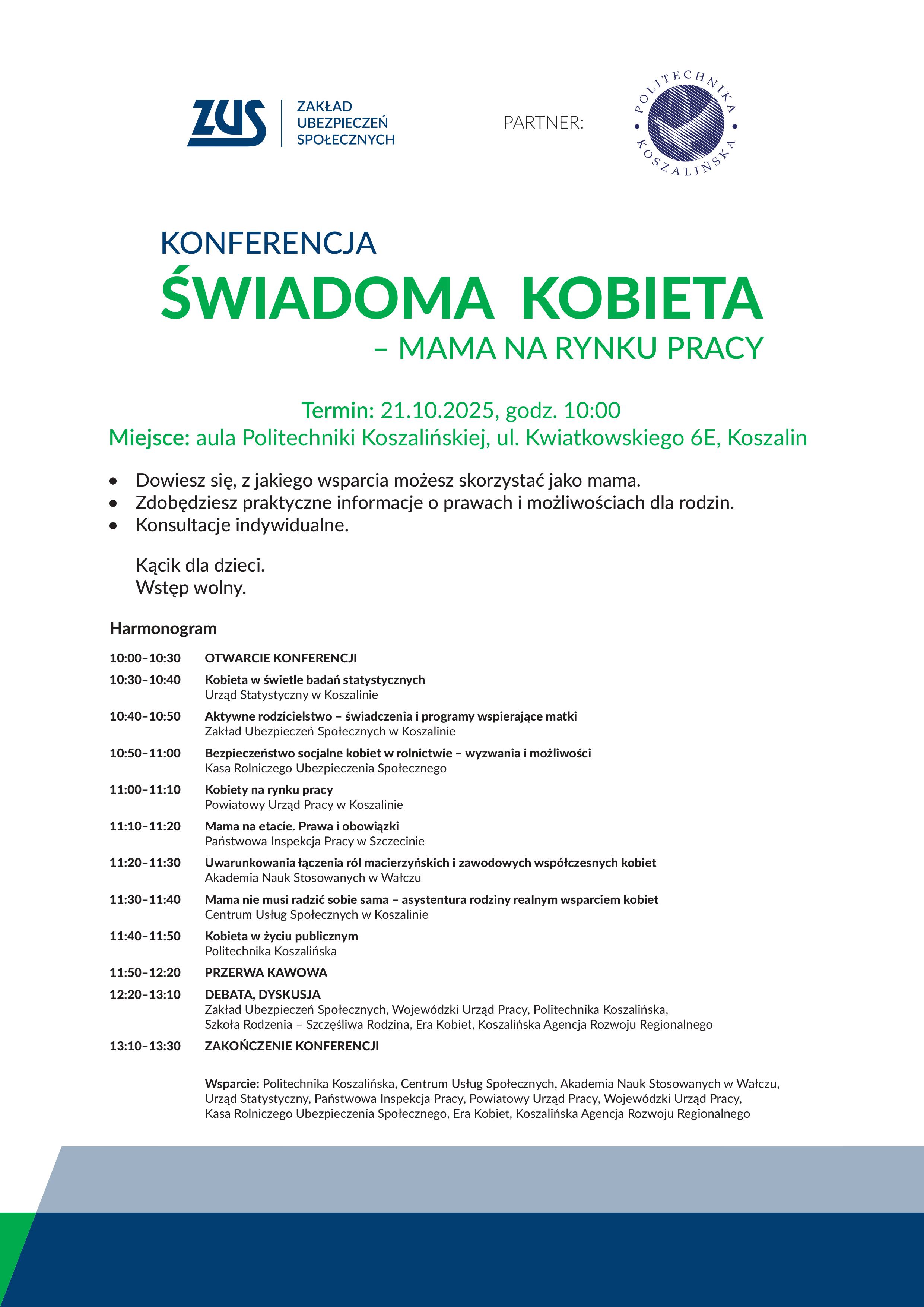 Miasto Koszalin zaprasza na konferencję „Świadoma kobieta – mama na rynku pracy”, która odbędzie się 21 października 2025 r. o godz. 10.00 w auli Politechniki Koszalińskiej przy ul. Kwiatkowskiego 6E.