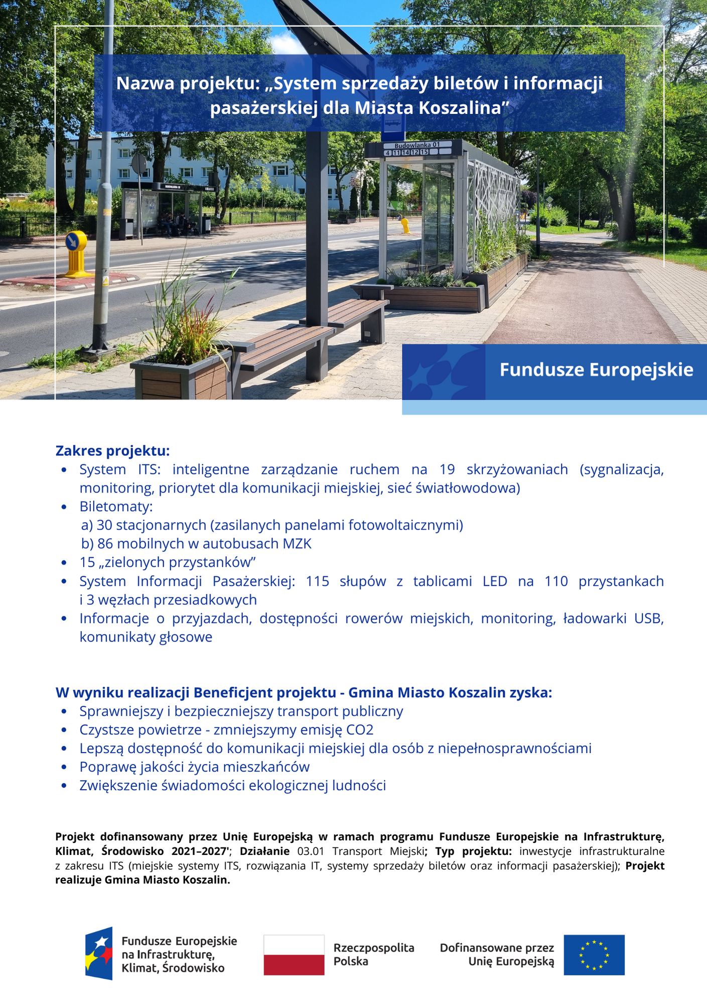 Miasto Koszalin realizuje projekt pn. „System sprzedaży biletów i informacji pasażerskiej dla Miasta Koszalina”, który uzyskał dofinansowanie z Funduszy Europejskich na Infrastrukturę, Klimat i Środowisko 2021–2027, w ramach Działania 3.1 Transport miejski.