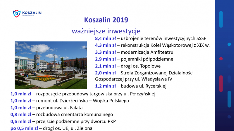 Podczas najbliższej sesji Rady Miejskiej (20 września) radni pochylą się nad przyszłorocznym budżetem Koszalina. Projekt budżetu przewiduje, że ogólna kwota budżetu, tj. dochodów i przychodów oraz wydatków i rozchodów, wynosi 624,5 mln zł. Prognoza dochodów wynosi 588,8 mln zł, natomiast limit wydatków określono na kwotę 599,1 mln zł. Występujący deficyt budżetu w wysokości 10,3 mln zł oraz rozchody w kwocie 25,4 mln zł proponuje się sfinansować przychodami w wysokości 35,7 mln zł. Nadwyżka operacyjna zaplanowana na 2019 rok wynosi 18,2 mln zł. Szczegóły dotyczące projektu budżetu można znaleźć poniżej.