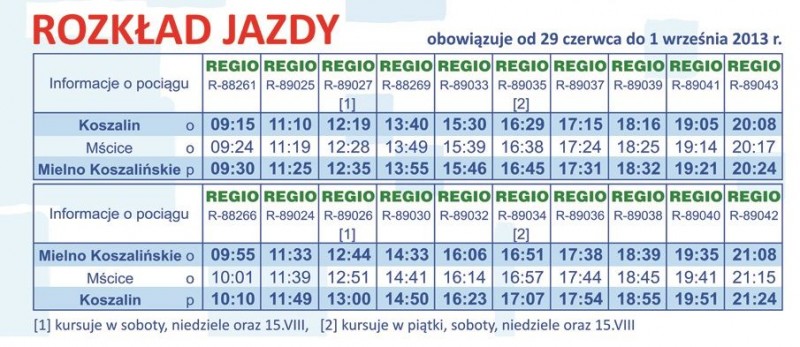 W tym roku po raz szósty zostanie uruchomione połączenie kolejowe do Mielna Koszalińskiego. Szynobus także rozpoczyna swoje kursy 29 czerwca i jeździć będzie do 1 września. Pierwszy pociąg odjeżdżać będzie z Koszalina o godz. 9.15 i po 15 minutach będzie w Milenie. Kolejne składy wyruszać będą o godz. 11.10, 13.40, 15.30, 17.15, 18.16, 19.05 i 20.08. Kursy powrotne przewidziane są w godz. 9.55, 11.33, 14.33, 16.06, 17.38, 18.39, 19.35 i 21.08. Rozkład jazdy został tak dopasowany, aby turyści mogli swobodnie dojechać do miejsca docelowego a mieszkańcy Koszalina do Mielna. Aby zwiększyć komfort podróży na trasie Koszalin-Mielno Koszalińskie wprowadzono w tym roku cztery dodatkowe kursy, tj. w weekendy i 15.08 o godz. 12:19 z Koszalina a z Mielna o 12:44, a od piątku do niedzieli oraz 15.08 kurs z Koszalina o godz. 16:29 i z Mielna o 16:51.