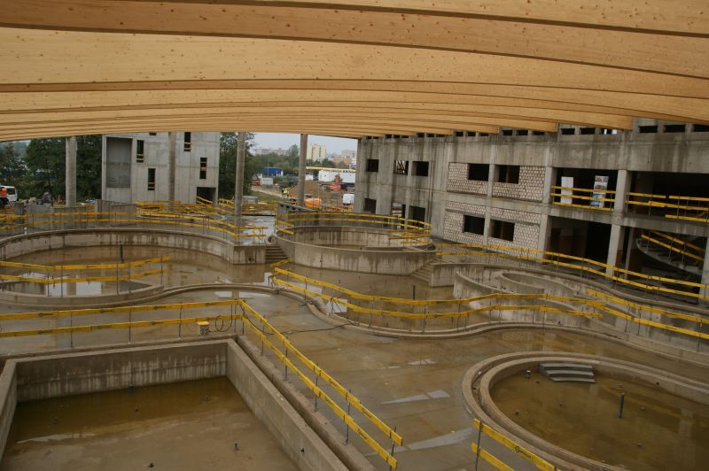 Obiekt koszalińskiego aquaparku przy ul. Rolnej/Gdańskiej rośnie w oczach. Codziennie pracuje tutaj około 100 osób. Efekty tej pracy widać: 9 października na obiekcie zawieszona została symboliczna wiecha - znak, że ostatni element konstrukcji dachu jest już zamontowany.