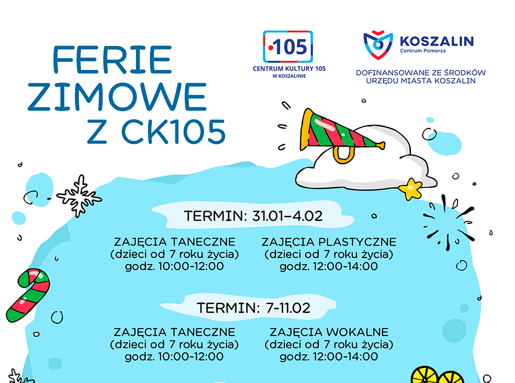 Zapraszamy do zapisów na zajęcia organizowane w ramach ferii zimowych w Centrum Kultury 105.