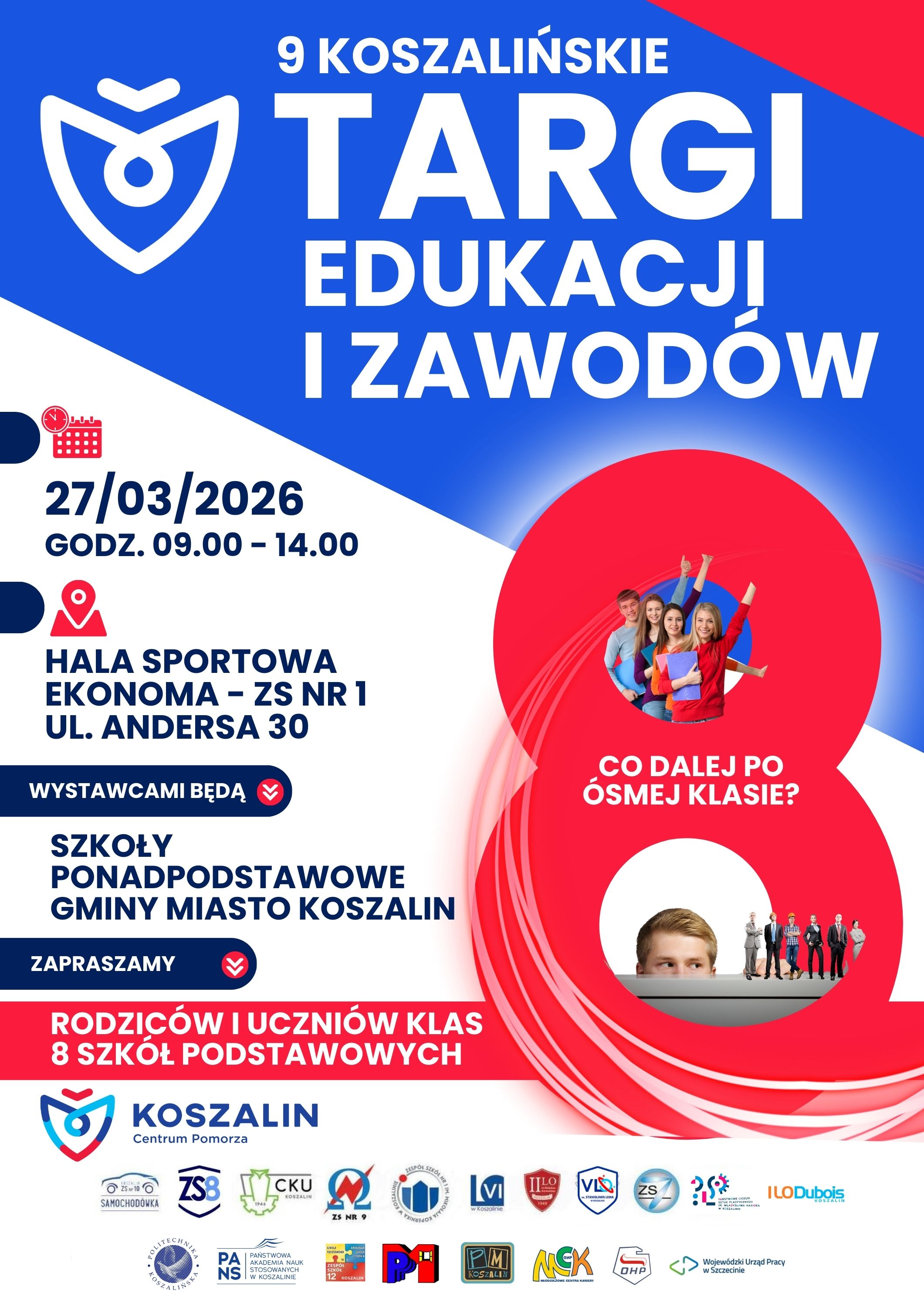 Zapraszamy uczniów klas ósmych oraz ich rodziców na Koszalińskie Targi Edukacyjne, które odbędą się 27 marca 2026 r. w Zespole Szkół nr 1 im. Mikołaja Kopernika, ul. Władysława Andersa 30.