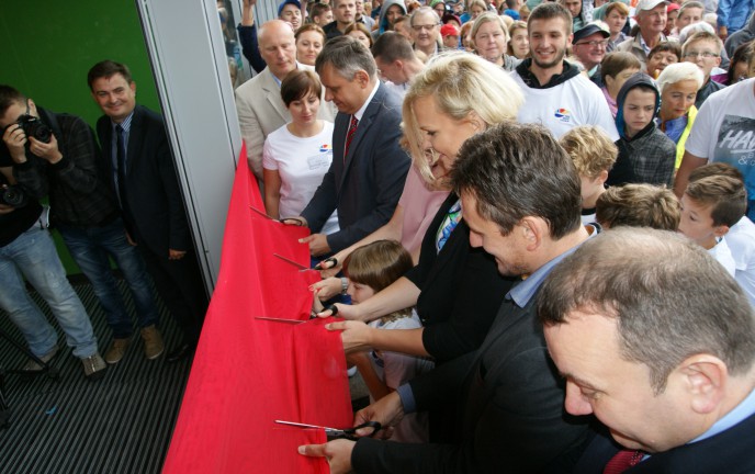 Prezydent Miasta przecina wstęgę podczas otwarcia Parku Wodnego Koszalin