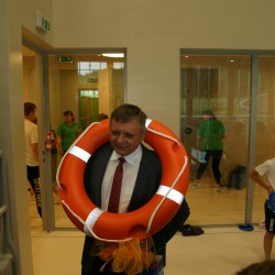Prezydent Miasta przecina wstęgę podczas otwarcia Parku Wodnego Koszalin