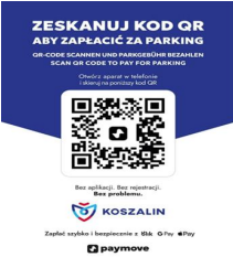 Na podany podczas transakcji adres e-mail kierowca otrzymuje potwierdzenie wniesienia opłaty. 10 minut przed zakończeniem czasu parkowania serwis przysyła przypomnienie z opcją przedłużenia parkowania. QR Kody znajdują się na tablicach (wirtualnych parkomatach). Paymove – jak to działa? System oparty jest na prostym i intuicyjnym procesie płatności: