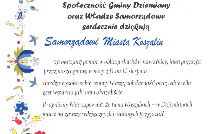 30 sierpnia radni podjęli uchwałę o wspomożeniu gminy Dziemiany kwotą 50 tys. zł. Fundusze przekazano na likwidację szkód, które dotknęły mieszkańców gminy podczas nawałnicy z 11 na 12 sierpnia. W odpowiedzi Leszek Pobłocki, wójt gminy Dziemiany, przesłał list z podziękowaniami za solidarność i gest wsparcia.