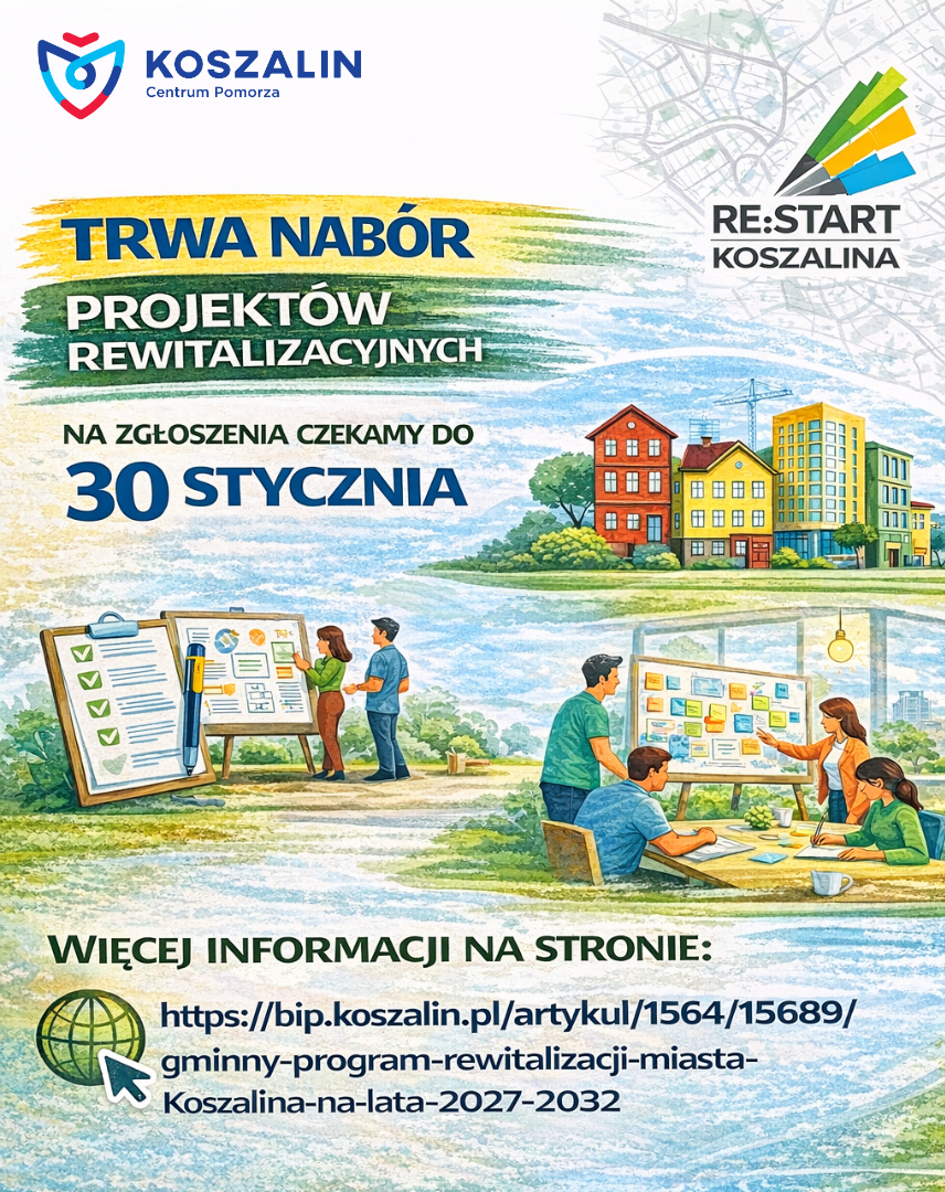 Zapraszamy do składania propozycji projektów rewitalizacyjnych do Gminnego Programu Rewitalizacji Miasta Koszalina. Nabór trwa do 30 stycznia 2026 r.