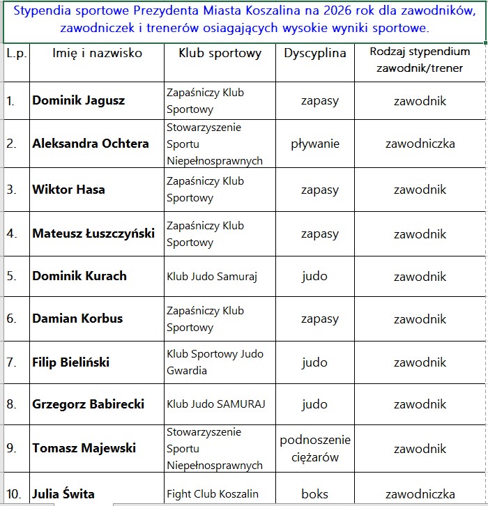 Urząd Miejski w Koszalinie informuje, że wnioski o przyznanie stypendiów sportowych Prezydenta Miasta Koszalina za wybitne osiągnięcia sportowe w 2026 roku, będą przyjmowane do 30 października 2026 r.
