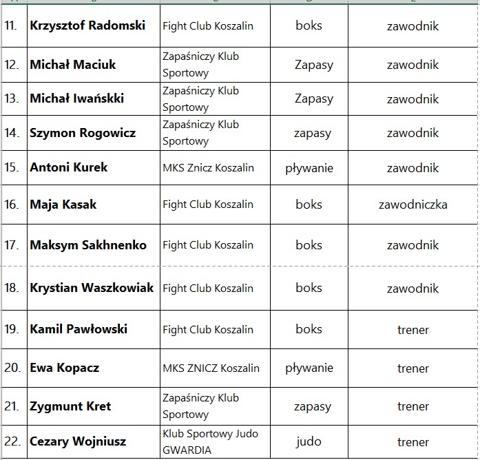 Komisja nie jednogłośnie podjęła pozytywną opinię, w przypadku 22 wniosków o przyznaniu stypendiów sportowych Prezydenta Miasta Koszalina na 2026 rok zawodnikom i trenerom, którzy osiągnęli wysokie wyniki sportowe w 2025 roku, w tym: